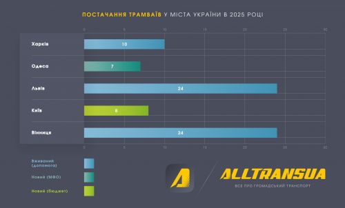 Український ринок трамваїв продовжив у 2025 році своє падіння. Так, з з 73 трамвайних вагонів, отриманих протягом року, 58 - це були вживані вагони, а лише 15 - нові, придбані за бюджетний кошт та в рамках співпраці з Міжнародними фінансовими організаціями (МФО). Так виходить, що закупівля нових трамваїв - це останній пріорітет у всіх міських владах, хоча трамвай щоденно перевозить велику кількість пасажирів. |