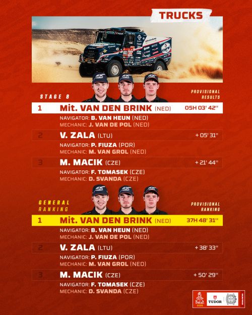 А от головна інтрига зараз - це виступ дебютанта Кея Хузінка на Renault Trucks C460. На 8 етапі він приїхав 5-м, пропустивши попереду свого дядька Герта Хузінка теж на Renault Trucks.