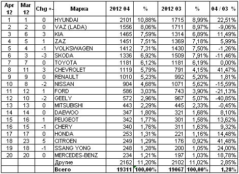 На четвертое место в апреле вышел ZAZ. И тоже с ростом объемов продаж. Как сообщил AUTO-Consulting начальник отдела маркетинга официального дистрибьютора ЗАЗ в Украине компании «АвтоЗАЗ-сервис» Александр Калинин, «В апреле бренду ЗАЗ удалось улучшить свои позиции на рынке и показать рост в 6% по отношению к предыдущему месяцу. В то же время рынок вырос всего лишь на 1,3%. Это во многом обусловлено уникальными акционными условиями «финансирования» авто – программой «Лучше чем рассрочка». По ней можно приобрести любой автомобиль ЗАЗ 2012 года выпуска с первоначальным взносом от 10%, сроком до 7 лет. И не платить при этом совершенно никаких процентов по кредиту в первые 18 или 24 месяца. За первый месяц по этой программе было реализовано почти 100 автомобилей. Акция долгосрочная, поэтому в ближайшие месяцы следует ожидать ещё более высоких результатов. Доля кредитных продаж ЗАЗ выросла до отметки в 24%».