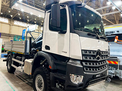 Саме цікаве, що тепер в повноприводному сегменті з'явилася пропозиція і від Mercedes-benz Arocs 4x4. На виставці можна було побачити бортовий автомобіль з КМУ на базі Arocs 1732. Таке рішення тепер буде пропонувати "Будшляхмаш", який став партнером-забудовником Mercedes-Benz в Україні і пропонує клієнтам власні автомобілі на 7 типах шасі.