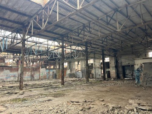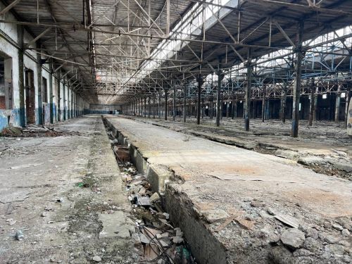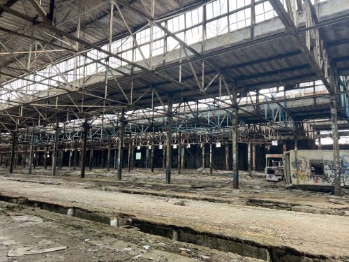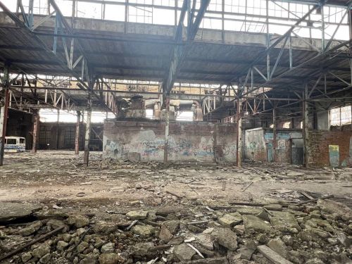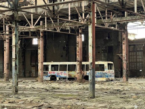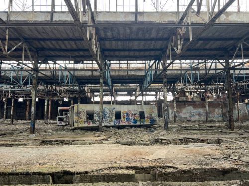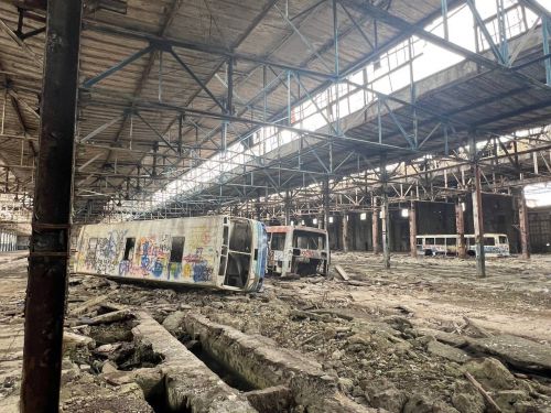 А зараз, тут лежить декілька остовів розграбованих автобусів. Да і сам цех пограбовано. Зрізано металеві частити там, де можна було достати.