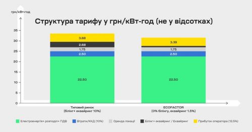 У результаті типовий тариф для кінцевого клієнта формується в діапазоні приблизно 32,1–34,2 грн за кВт·год. Окремо варто зазначити, що частина операторів додатково несе фінансове навантаження за кредитами. Це обладнання, підключення потужності, монтаж, сервіс. Тому тариф у таких випадках також має покривати відсотки та регулярні виплати, що напряму впливає на цінове рішення.